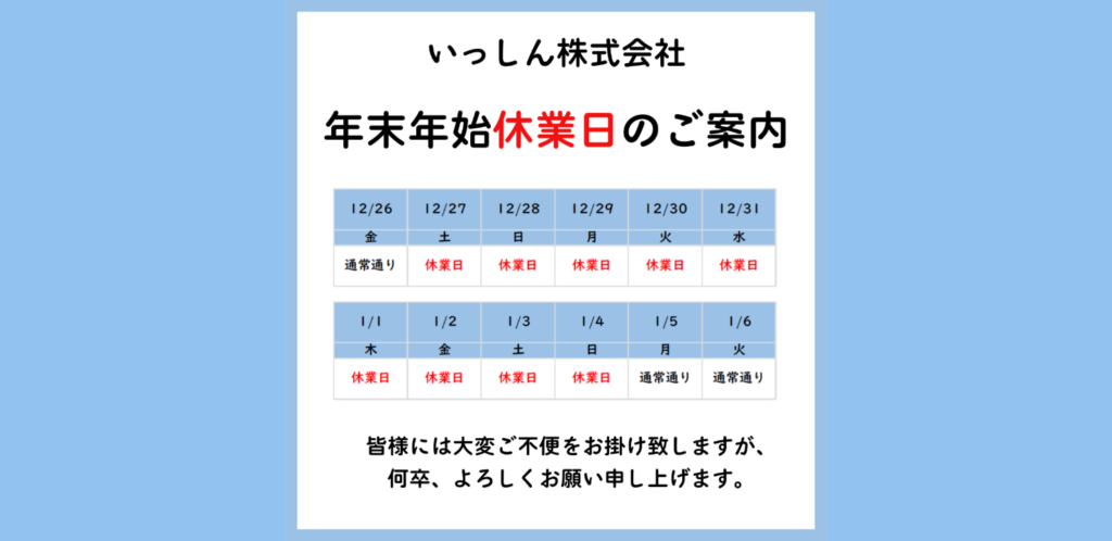 - 2025/12/9 【年末年始の休業日について】【お知らせ】 2025年も残すところわずかとなってきましたが、皆様いかがお過ごしでしょうか。 さて、弊社では年末年始につきまして下記のとおり休業いたします。 休業日<2025年12月27日(土)~2026年1月4日(日) […]