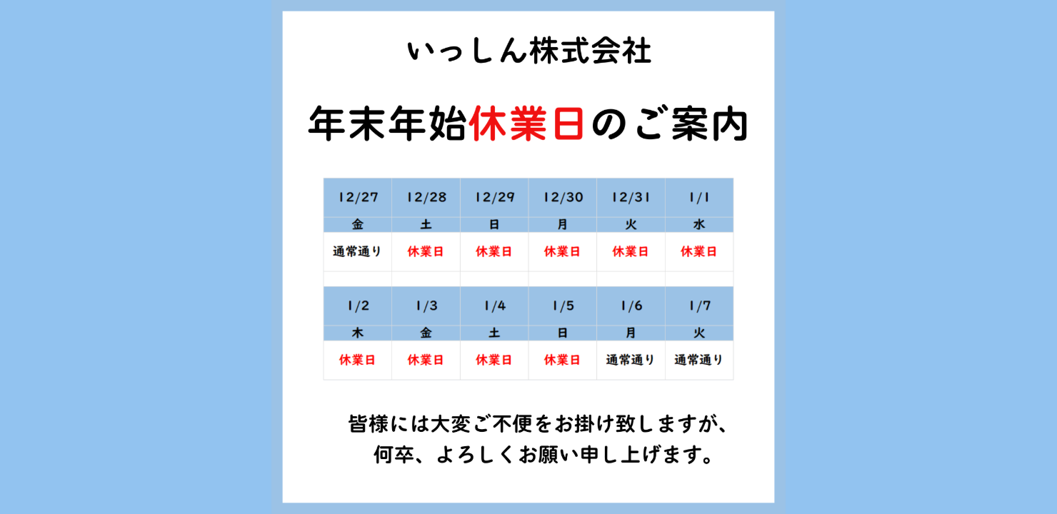 さて、弊社では年末年始につきまして下記のとおり休業いたします。