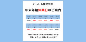 【お知らせ】 2025年も残すところわずかとなってきましたが、皆様いかがお過ごしでしょうか。 さて、弊社では年末年始につきまして下記のとおり休業いたします。 休業日<2025年12月27日(土)~2026年1月4日(日) […]